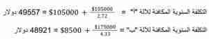 بعد ذلك، يجب تقسيم التكاليف الأولية على عامل الأقساط السنوية وإضافة تكلفة الصيانة السنوية. حساب التكلفة السنوية المكافئة هو: