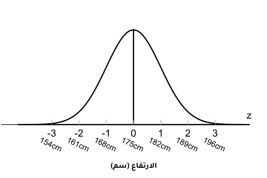 كما يوضح الرسم البياني أدناه، يتوافق معظم الأشخاص مع هذا المتوسط. وفي الوقت نفسه، يوجد الأشخاص الأطول والأقصر، ولكن مع تواتر متناقص في عدد السكان. وفقًا للقاعدة التجريبية، سوف يسقط 99.7% من جميع الأشخاص بمقدار +/- ثلاثة انحرافات معيارية للمتوسط ، أو بين 154 سم (5 ‘0 “) و 196 سم (6’ 5”). هؤلاء الأطول والأقصر من هذا سيكون نادرًا جدًا (0.15 % فقط من السكان).