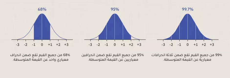 بالنسبة لجميع التوزيعات العادية، سيظهر 68.2% من الملاحظات ضمن انحراف معياري واحد للمتوسط زائد أو ناقص؛ 95.4% من المشاهدات تقع ضمن +/- انحرافين معياريين؛ و 99.7% ضمن +/- ثلاثة انحرافات معيارية. يشار إلى هذه الحقيقة أحيانًا باسم “القاعدة التجريبية”، وهي عبارة عن إرشاد يصف مكان ظهور معظم البيانات في التوزيع العادي.