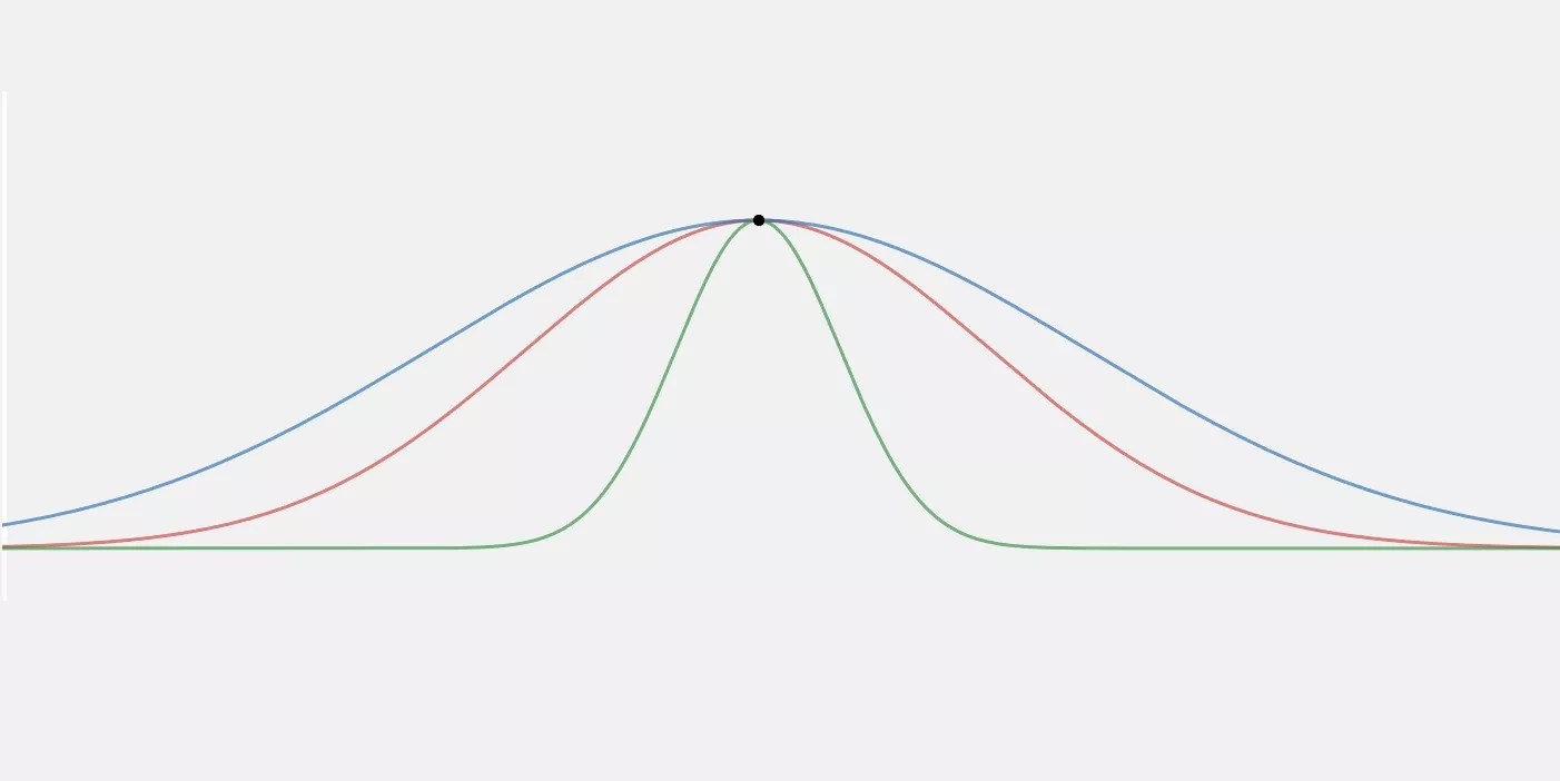 أولاً، متوسطها (المتوسط)، والوسيط (نقطة الوسط)، والوضع (الملاحظة الأكثر شيوعًا) كلها متساوية مع بعضها البعض. علاوة على ذلك، تمثل هذه القيم جميعًا ذروة أو أعلى نقطة للتوزيع. ثم يقع التوزيع بشكل متماثل حول الوسط، والذي يتم تحديد عرضه من خلال الانحراف المعياري.