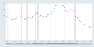 يبدو أن معدل دوران النقود قد وصل إلى أدنى مستوياته عند 1.435 مرة في الربع الثاني من عام 2017 وكان يرتفع تدريجياً حتى أدى الركود العالمي الناجم عن جائحة كوفيد 19 إلى تحفيز الاقتصاد الفيدرالي الأمريكي الضخم. وفي نهاية الربع الثاني من عام 2020، بلغ معدل دوران النقود لـ(M2) حوالي 1.100 مرة، وهي أدنى قراءة لمعدل دوران النقود (M2) في التاريخ.4